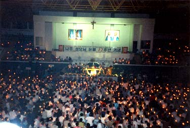 The 12th anniversary of the Blessed Mother’s first weeping tears in Naju was held in Naju Gymnasium. Four to five thousand people, including Korean and foreign priests, gathered and prayed. The Blessed Mother’s statue, which had wept, was placed in the gymnasium, and I heard the Blessed Mother’s beautiful voice coming from the statue.