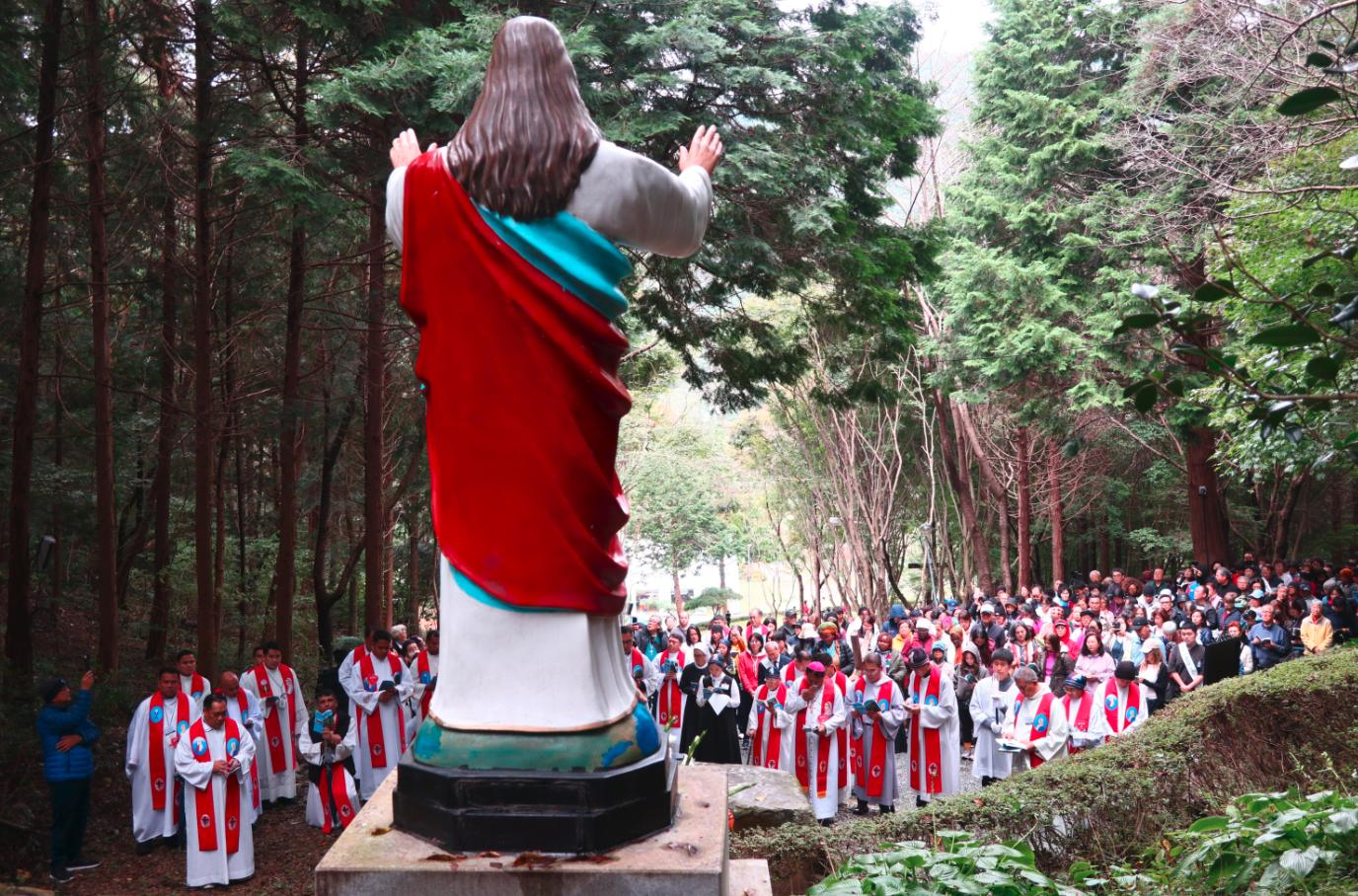Priests giving a blessing together before the statue of the Risen Jesus at the 15th Station