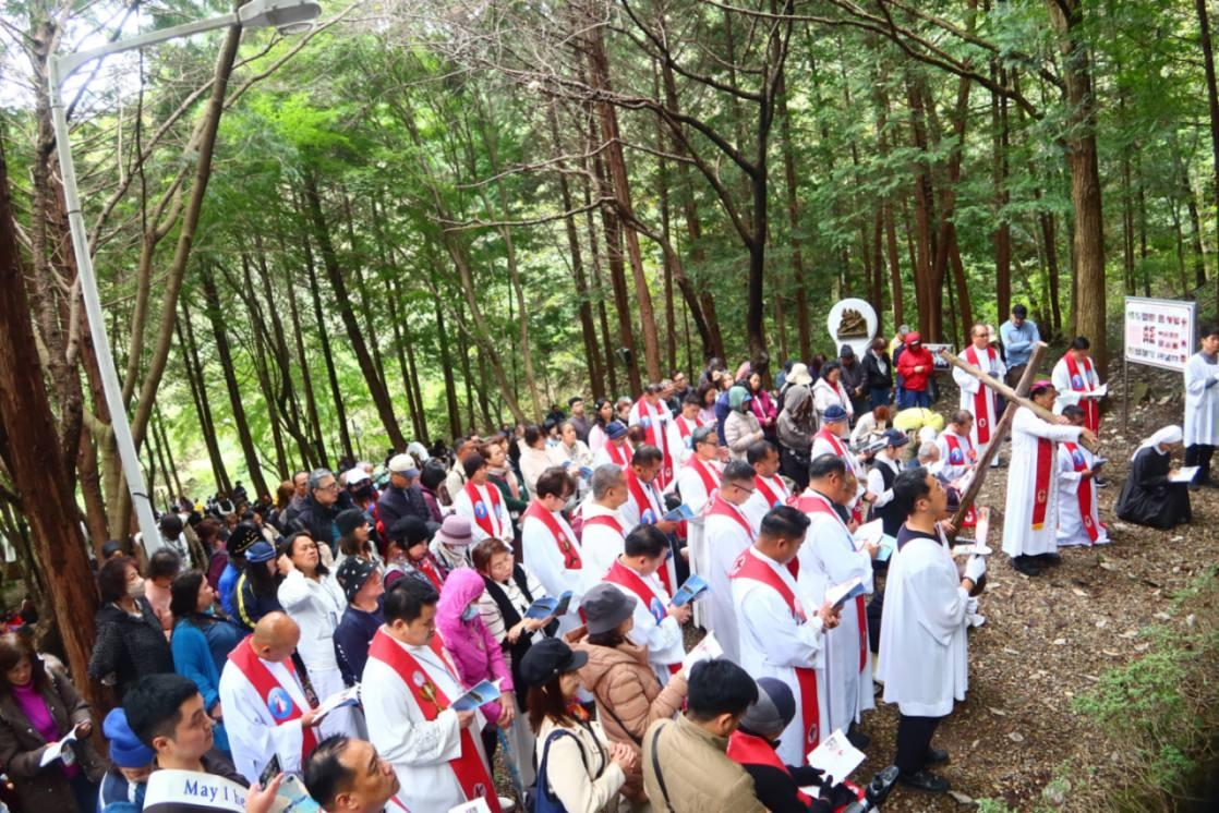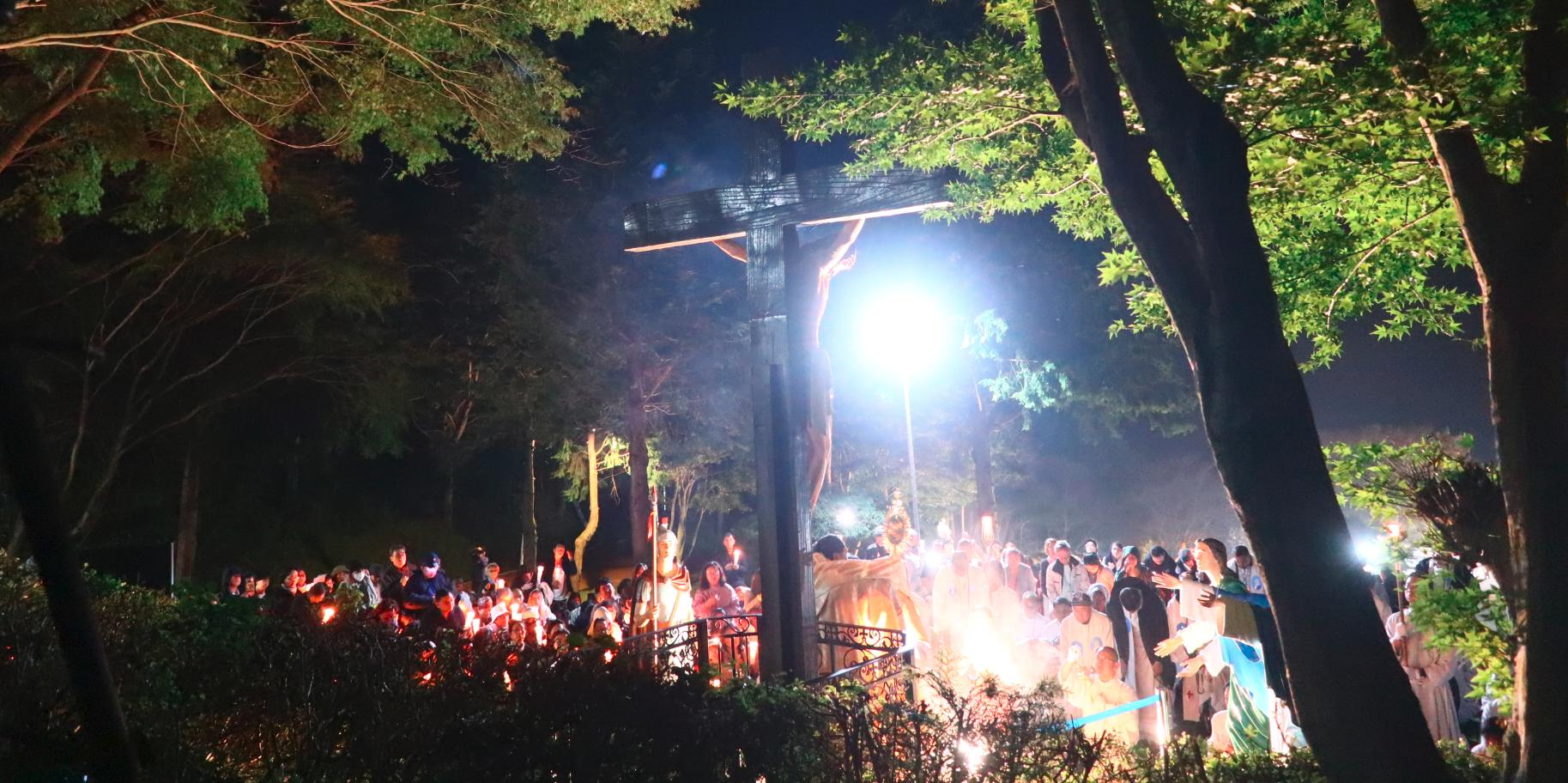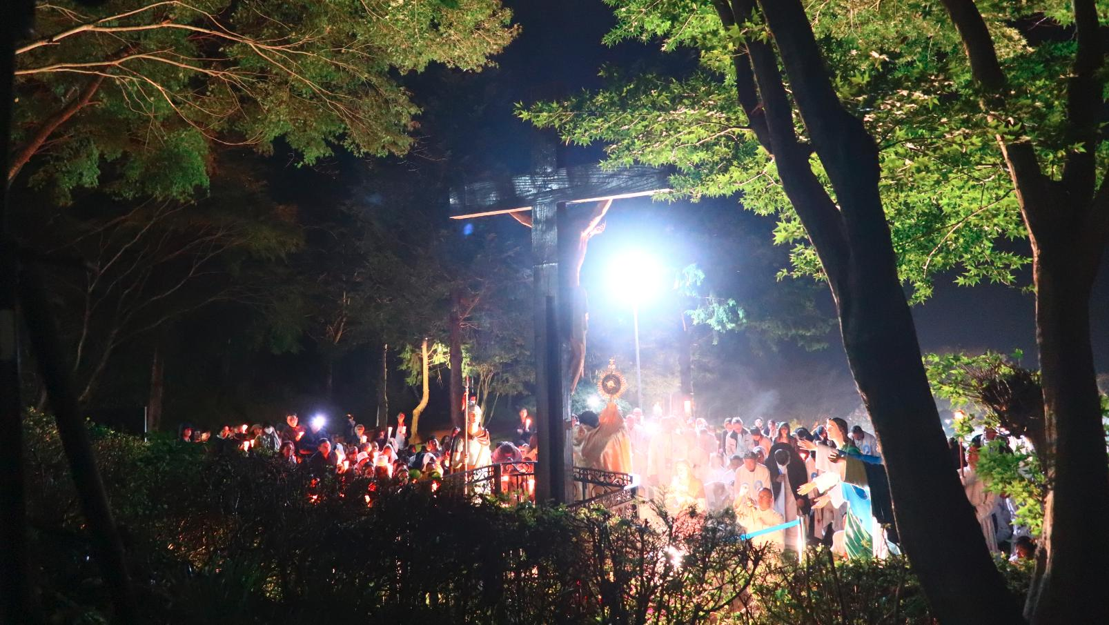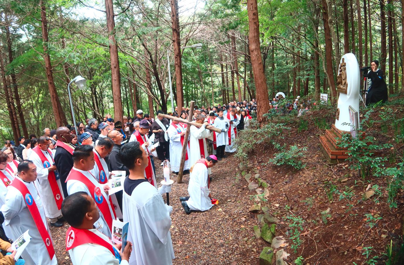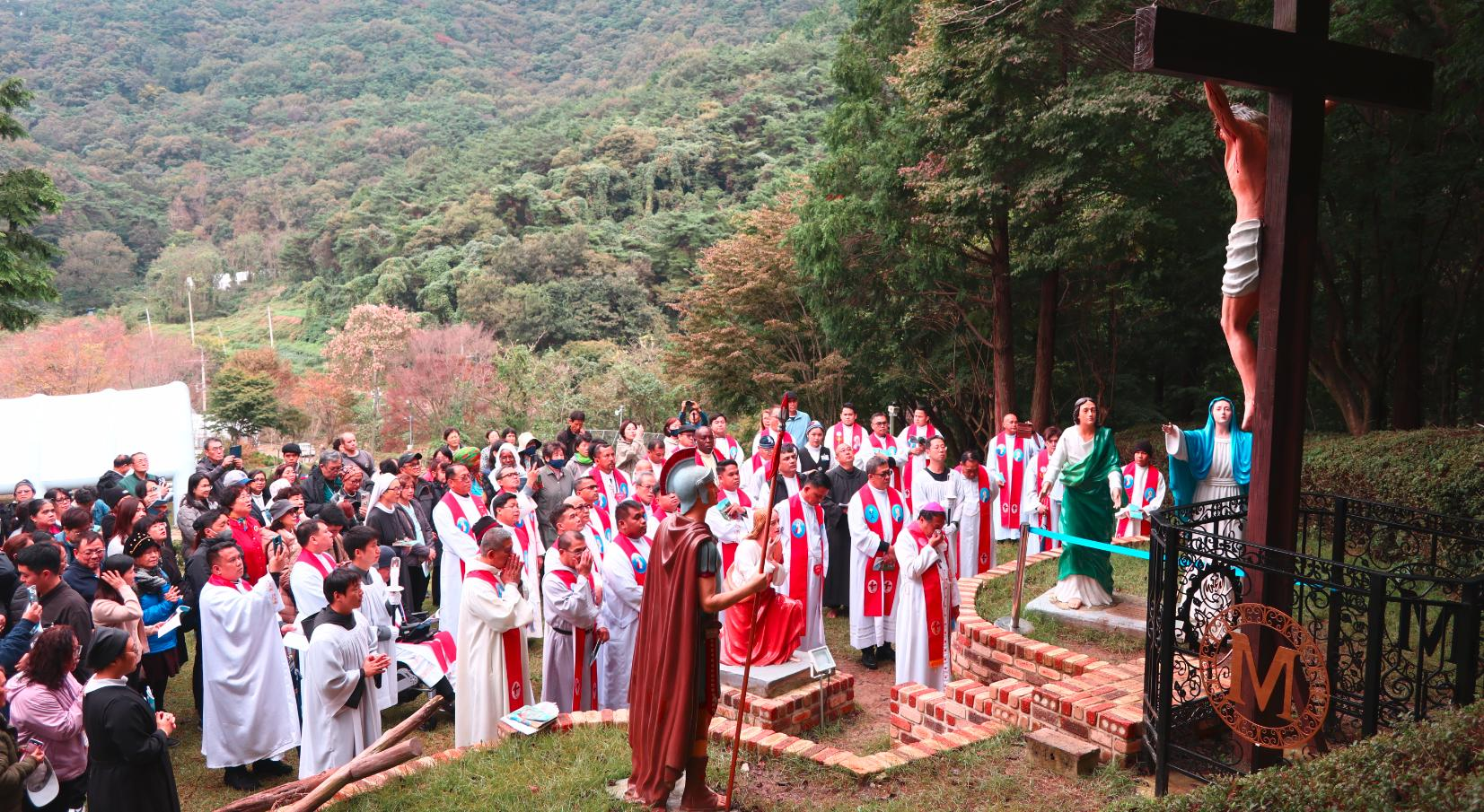Clergy and pilgrims kneeling and praying under the Crucifix at Calvary Hill