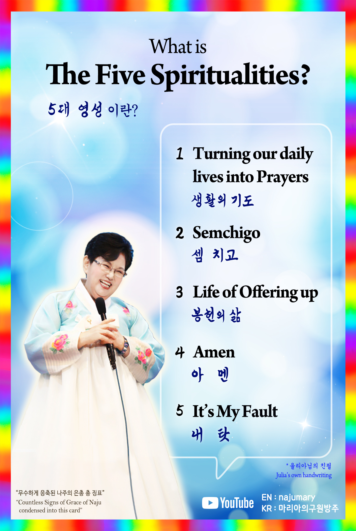 I have been able to learn and live out the Five Spiritualities, and I am so, so grateful to Mama Julia for teaching me. I live a life full of unspeakable gratitude. Mama Julia, I am truly happy. Mama, I love you. I give all of this glory to the Lord and the Blessed Mother. Thank You.June 3, 2023